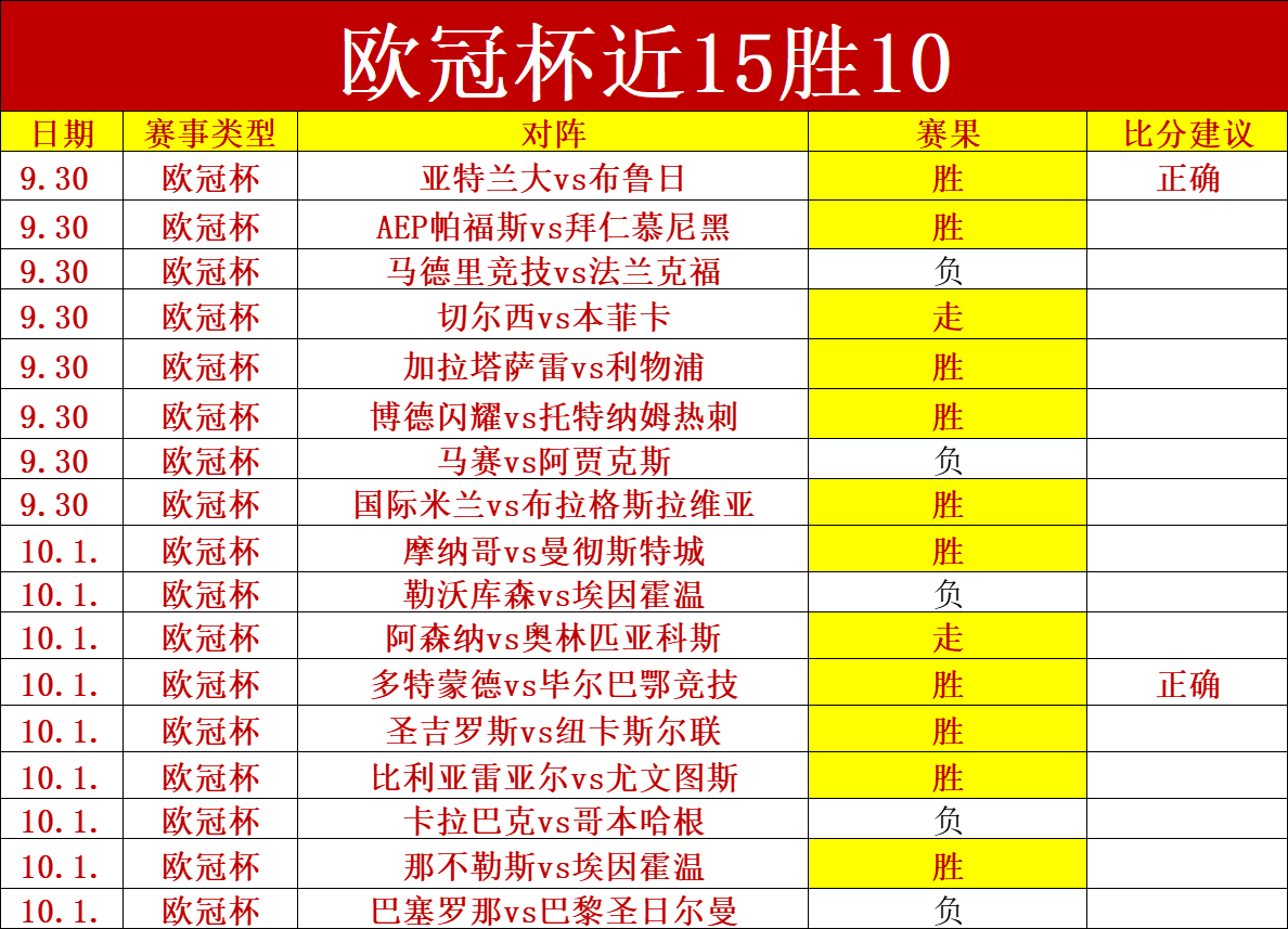 一、战绩回顾:昨天5胜3,命中2场比分,出色状态迅速回归,意甲、西甲、巴西3场打出,今天拿手欧冠杯来了,欧冠杯近15胜10,今天欧冠杯大可放心。