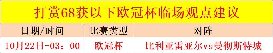 注:今日打赏68可获以下欧冠杯场临场观点建议