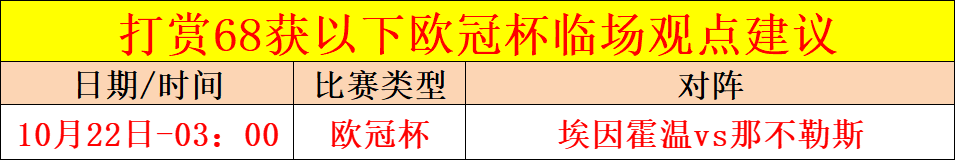 注:今日打赏68可获以下欧冠杯场临场观点建议