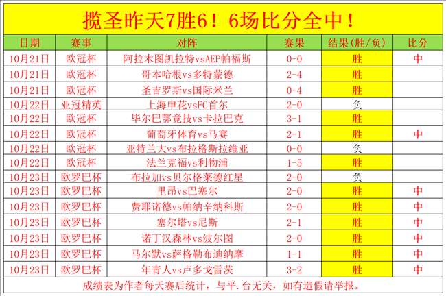 成绩回顾:昨天表现非常出色,7场比赛打出了6场,且6场比分全部命中!目前是6连胜的火热势头,今天我们再接再厉!