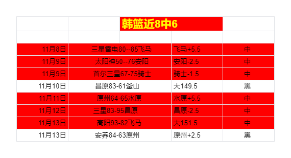 韩篮保持稳定,近8中6.今天三场挑选两场信心场次,共同进步一起前进